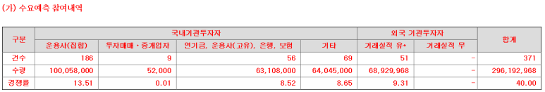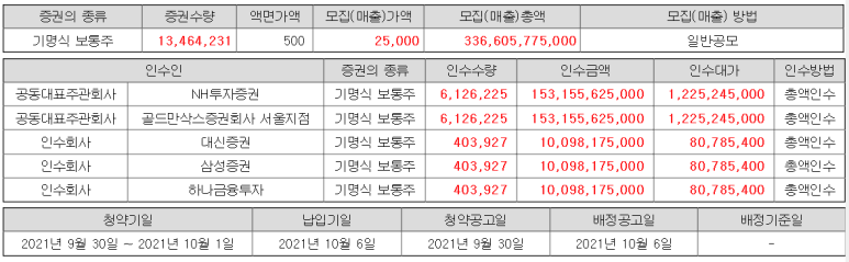 | 시가총액 | 기관경쟁률 | 의무보유확약 | 유통가능주식 | 공모가 | 주간사 |