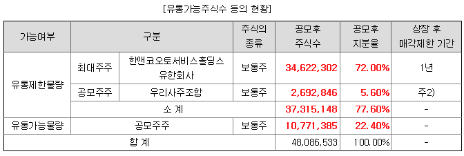 상장일 유통 가능 물량은 22% 정도 됩니다. 다행스럽다고 해야 되는지 상장일 유통 가능 물량은 공모주주밖에 없네요