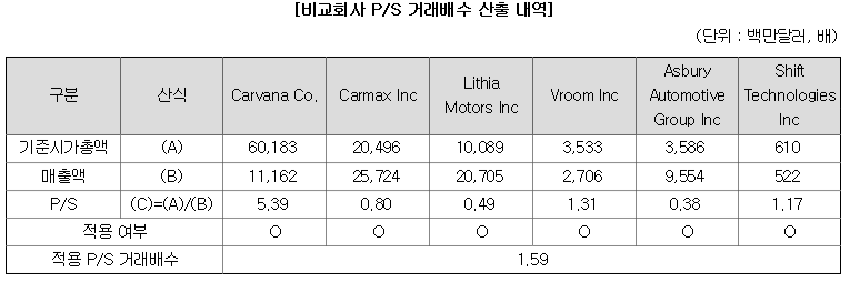 유사기업의 평균 PSR이 1.59, 케이카는 공모가 25,000원 기준이면 0.6배 정도로 낮아집니다. 공모가 밴드가 어이없게 정해졌다고 볼 수 있네요