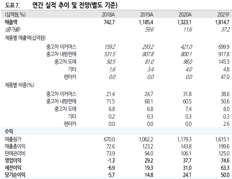 매출 추이보다 매출 비중을 보면 확실하게 온라인 매매 비중이 높아지는 것을 볼 수 있습니다. 오프라인 시장에서 80%가 넘는 시장점유율을 보이고 있는 만큼 향후 중고차 이커머스 시장의 발전과 함께 성장을 기대하게 되는 것 같습니다. 그럼에도 아직까지 영업 이익은 5%가 안 되는 만큼 수익률 확보가 시급하다고 볼 수 있겠습니다.