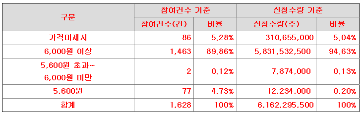 수요예측 결과는 1,565 대 1입니다. 수요예측은 평균 이상의 성적을 보였는데, 의무보유확약은 수치가 조금 이상합니다. 투자설명서에는 14.15%로 나오는데, 1,402,263,500/6,162,295,500 을 직접 해보니 22%가 나옵니다. 어떤 수치가 맞는지 잘 모르겠는데, 만약 22%가 맞다고 하면 투자설명서조차 틀리는 회사의 신뢰도는 떨어질 수밖에 없을 것 같습니다.
